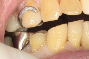 奥歯にしっかり入れ歯が入り、噛む力の負担が前歯に集中しなくなっているところがポイントです。