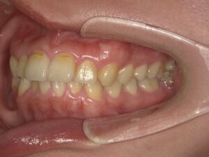 下の前歯のがたつきもなくなり、上の前歯が内側に入ってきているのが分かると思います。全体的にとてもキレイに仕上がり、大変満足していただけました。