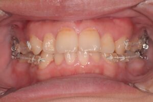 上の前歯にも装置がつき、少しづつワイヤーを太くしながら歯にかける矯正力を強くしていきます。