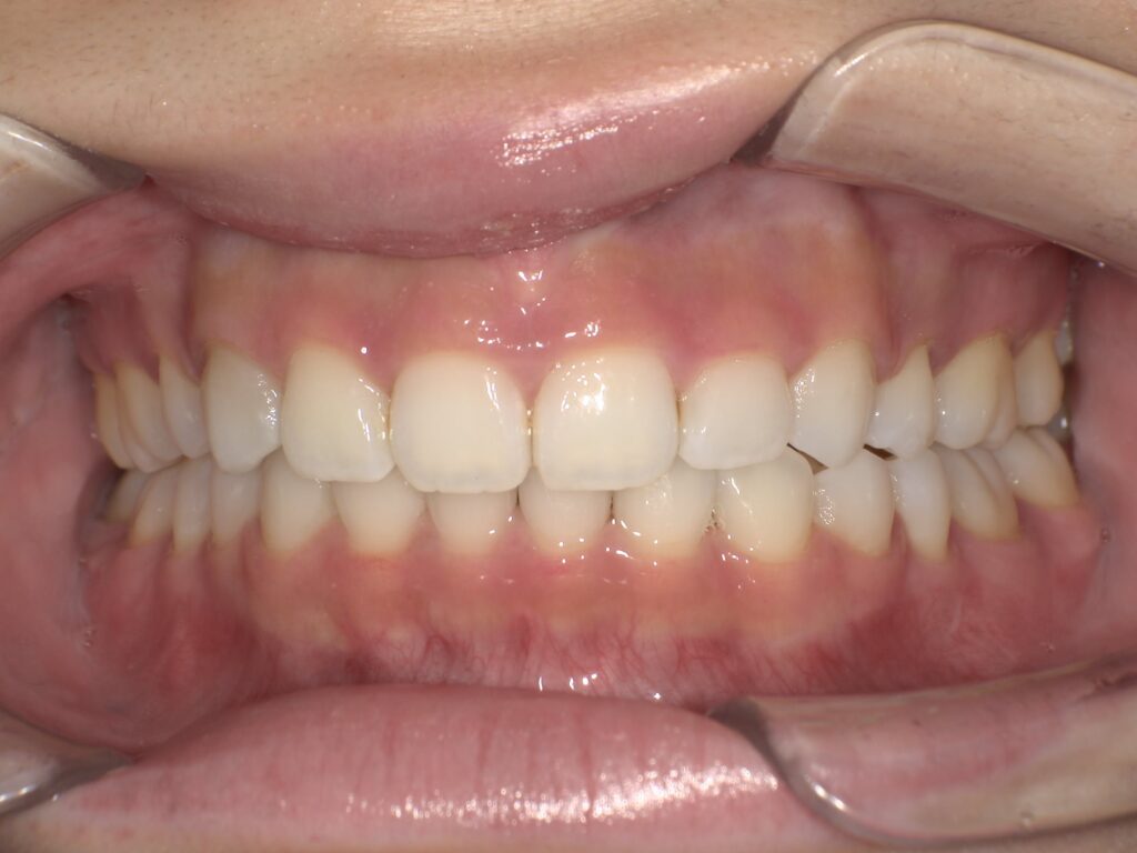 抜歯とスクリューを活用した本格ワイヤー矯正で、口元の印象が大きく変わった症例をご紹介します はじめに 「上の前歯が出ていて、口元が気になる…」 「下の歯がガタガタしていて、笑うときについ手で隠してしまう…」 こんなお悩みをお持ちの方、じつは少なくないんです。 歯並びが気になっていても、「矯正って何年もかかるんでしょ?」「抜歯が必要って聞くと怖い…」と、なかなか一歩を踏み出せない方も多いのではないでしょうか。 今回は、上の前歯の突出と下の前歯のがたつきを主訴に来院された患者さんの、ワイヤー矯正の治療経過をご紹介します。 治療前の状態 まずは治療前のお口の中の写真です。 治療前・正面の写真 前方から見ると、上の前歯が前に出ているのが分かりますね。いわゆる「出っ歯」の状態です。それにより下の前歯が隠れてしまっている状態です。 治療前・左側の写真 治療前・右側の写真 横から見ると、上下の前歯の位置関係がよりはっきりと分かります。上の前歯がかなり前方に出ていますね。 治療前・下顎の写真 下の歯並びを見ると、前歯にがたつき(叢生)があるのが確認できます。歯が重なり合って並んでいる状態ですね。 治療前・上顎の写真 上の歯並びも確認していきます。これから治療を進めていくにあたって、この状態がスタート地点になります。 治療方針について 今回のケースでは、前歯をしっかり後ろに下げる必要がありました。 そのためには、歯を動かすスペースを確保しなければなりません。相談の結果、上の前から4番目の歯を抜歯して、スペースを作る方針になりました。 また、矯正の方法としては、マウスピース矯正とワイヤー矯正がありますが、今回のように前歯をしっかり下げたいケースでは、ワイヤー矯正のほうが向いていると考えます。 さらに、前歯を確実に後方へ引っ張るために、**上顎にスクリュー(矯正用のアンカースクリュー)**を使用しました。スクリューとは、小さなネジのような装置を骨に一時的に埋め込んで、歯を動かす際の固定源にするものです。これにより、効率よく前歯を後ろに引くことができます。 ワイヤー装着の様子 いよいよ矯正装置をつけていきます。 まずは上顎から装置をつけて行きます。 ワイヤー装着後・正面の写真 正面から見た、ワイヤーを装着した状態です。ここからいよいよ歯が動き始めます。 ワイヤー装着後・左側の写真 ワイヤー装着後・右側の写真 左右それぞれの側面です。ブラケットにワイヤーが通っているのが見えますね。 ワイヤー装着後・上顎の写真 上顎に装置とスクリューが装着された状態 上の前から4番目の歯を抜歯し、上顎に入れたスクリューとワイヤーを繋いで、前歯を後ろに引っ張っていきます。これが今回の治療のポイントになります。 治療中の経過 治療が進んでくると、少しずつ変化が見えてきます。 治療中・正面の写真 正面から見て、前歯の位置が変わり始めているのが分かりますね。 治療中・左側の写真 治療中・右側の写真 左右からも確認すると、上の前歯が少しずつ後方に下がってきているのが見えます。 治療中・上顎の写真 抜いたスペースが少なくなってきているのがわかると思います。 治療中・下顎の写真 前歯のがたつきはほぼ改善されています。 この段階では、上の歯は抜歯済みで後方に動かしながら、下顎にも装置が装着されました。上下同時に歯並びを整えていきます。 治療後の状態 そして、約2年の治療を経た結果がこちらです。 治療後・正面の写真 パッと見た時の印象が違いますよね。前歯の出っ張りが改善され、歯並びがきれいに整っています。 治療後・左側の写真 治療後・右側の写真 横から見ても、上下の前歯の位置関係がしっかり改善されているのが分かります。治療前と比べると、口元の印象がかなり変わりましたね。 治療後・上顎の写真 上顎の歯並びも、抜歯したスペースがきれいに閉じて、整った歯列になっています。 治療後・下顎の写真 下顎のがたつきもしっかり改善されていますね。治療前にあった歯の重なりがなくなり、きれいなアーチ状に並んでいます。 よくある質問 Q. ワイヤー矯正は痛いですか? A. ワイヤーを調整した後、2〜3日程度は歯が動く際の痛みを感じることがあります。ただ、多くの方が徐々に慣れていきますし、痛みが強い場合は痛み止めで対応できますので、ご安心ください。 Q. マウスピース矯正ではダメだったのですか? A. 今回のケースのように、前歯をしっかり後方に下げたい場合は、ワイヤー矯正のほうが向いている場合があります。症状によって最適な方法は異なりますので、どちらが合っているかは診察時にご相談いただければと思います。 Q. 抜歯は必ず必要ですか? A. すべての矯正治療で抜歯が必要になるわけではありません。ただ、前歯を大きく後ろに下げたい場合は、歯を動かすスペースを確保するために抜歯が必要になることがあります。抜歯の有無は、お口の状態を見て判断していき